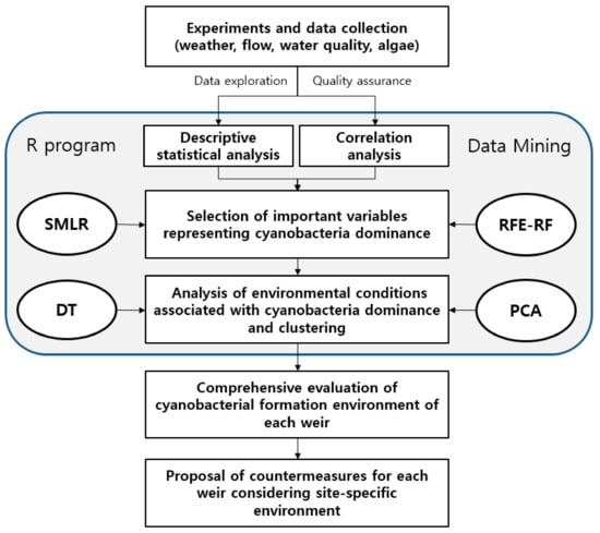For the mid-stream of the Nakdong River, which is the subject river of this study, Jung and Kim [] analyzed the relationship between chlorophyll a (Chl–a) and nutrients through the application of multivariate statistical methods (such as principal component and factor analysis), and reported that, in summer, algae are more affected by P- than N-based factors. However, the correlations between the Chl–a concentration, N, P, and other factors at each point along the river were different, likely due to the fact that the N, P, and Chl–a concentrations are affected by the pollution load, turbidity increase, and residence time variation due to rainfall runoff in rivers []. Therefore, for accurate analysis of the factors associated with algal overgrowth in rivers, additional data analysis of the meteorological and hydrological factors (such as rainfall and flow rates) are necessary, rather than the simple use of water quality as an explanatory variable []. Although many studies on the causes of algal blooms have been conducted, there is insufficient research on the causes of such blooms in large rivers, in which the physicochemical environment changes rapidly according to variations in precipitation and flow rate. Consequently, analysis of the correlations between the physicochemical factors influencing cyanobacterial dominance (which is the cause of algal blooms) through data mining is critical. In addition, comprehensive analyses of the important variables are essential for algal bloom control.