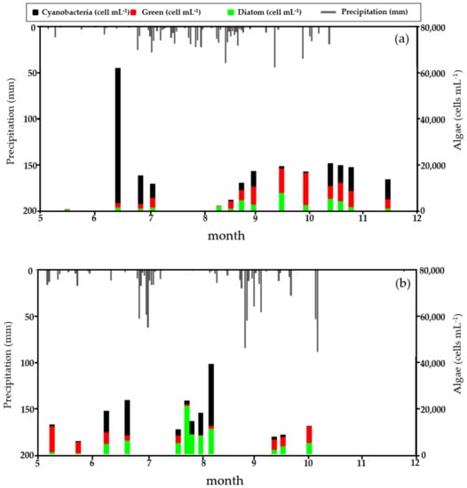 However, universal interpretation is difficult because the causes of algal blooms vary with the characteristics of a given watershed and water body, and because of the complex interactions between various factors. There are many different causes of algal blooms following excessive proliferation of cyanobacteria, which are largely divided into physical, biogeochemical, and physiological factors []. In terms of physical factors, cyanobacteria exhibit optimal growth at high temperatures (i.e., above 20 °C) and occur in large quantities in water bodies with low flow velocity and long residence time [,]. Cyanobacterial outbreaks coincide with (or are strongly associated with) the occurrence of thermal stratification [,,,,,], where the upper and lower layers of water bodies are not mixed and the water temperature in the upper layer remains high, which is appropriate for cyanobacterial growth. Furthermore, as the vertical turbulent mixing weakens, diatoms and green algae (with no buoyancy control function) sink below the photic zone, whereas cyanobacteria tend to be concentrated in the surface layer [,]. Chung et al. [] demonstrated that the overgrowth and spatiotemporal distribution characteristics of Microcystis in a reservoir with strong thermal stratification are determined by the interaction between the physical mixing characteristics in the reservoir and the buoyancy control function of cyanobacteria. Furthermore, Moss and Balls [] and Wu et al. [] analyzed phytoplankton production using hydrological factors such as precipitation, flow velocity, and channel width. Their results showed that the phytoplankton community structure in the studied rivers correlated significantly with physical factors such as channel width and flow velocity.