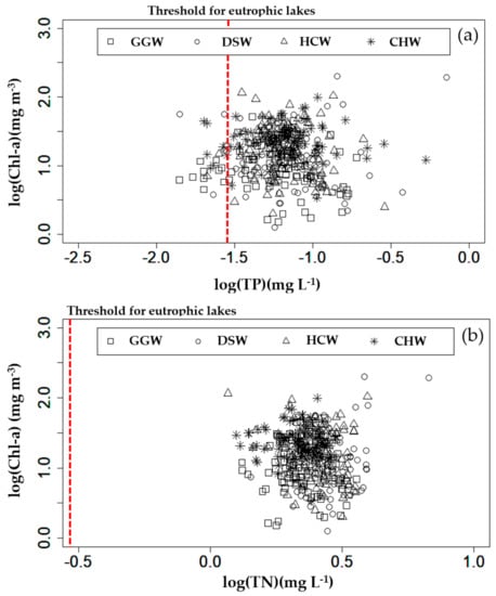 Correlations between; (a) Log (Chl–a) (mg m−3) and Log (TP) (mg L−1), and (b) Log(Chl–a) (mg m−3) and Log (TN) (mg L−1) at Gangjeong Goryeong weir (GGW), Dalseong weir (DSW), Hapcheon Changnyeong weir (HCW), and Changnyeong Haman weir (CHW).