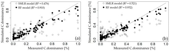 A parsimonious model for predicting C.dominance via the SMLR method was developed. The extraction results of the important environmental variables are listed in Table 2. The Adj.R2, RMSE, Mallows’ CP statistics, and AIC values of the model according to the independent variables are also presented in Table 2.