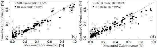 Comparison of measured cyanobacterial dominance with simulated results using step-wise multiple linear regression (SMLR) and random forest (RF) models at; (a) Gangjeong Goryeong weir (GGW), (b) Dalseong weir (DSW), (c) Hapcheon Changnyeong weir (HCW), and (d) Changnyeong Haman weir (CHW).