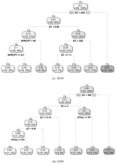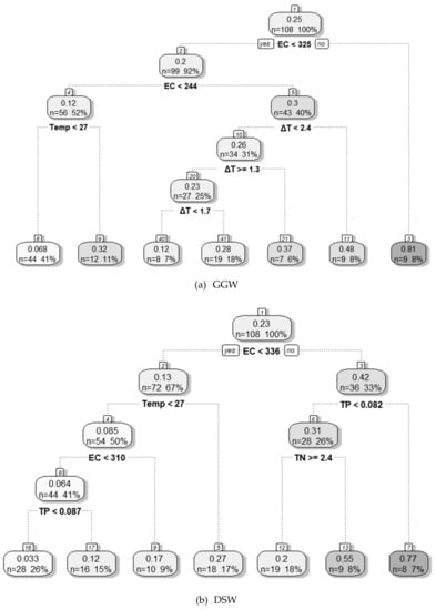 The DT model was developed using the important variables selected by the RFE-RF method to evaluate the environmental conditions corresponding to a high cyanobacterial dominance ratio at each weir. The evaluation results obtained for each weir using the DT model are presented in Figure 6.