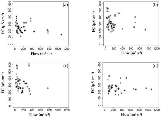 Correlation between electrical conductivity (EC) (µS cm−1) and flow rate (m3 s−1) at; (a) Gangjeong Goryeong weir (GGW), (b) Dalseong weir (DSW), (c) Hapcheon Changnyeong weir (HCW), and (d) Changnyeong Haman weir (CHW).