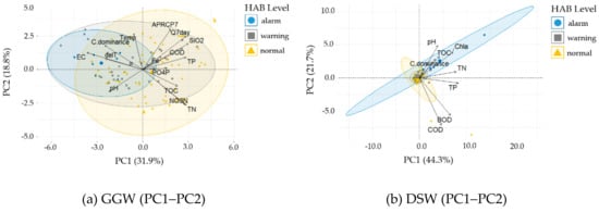 In the DSW (Table 4), TP, TN, Chl–a, BOD, COD, and pH have the greatest effect on the positive direction of PC1, while COD and BOD have the greatest effect on the negative direction of PC2. C.dominance has the largest effect on PC1 and PC2. In the bi-plot for PC1 and PC2, the C.dominance loading vector forms a cluster in the same direction as pH, TOC, and Chl–a (Figure 8b). Furthermore, the data corresponding to a cyanobacterial cell density higher than 10,000 cells mL−1 appear under the conditions of high TOC, pH, Chl–a, and cyanobacterial share.