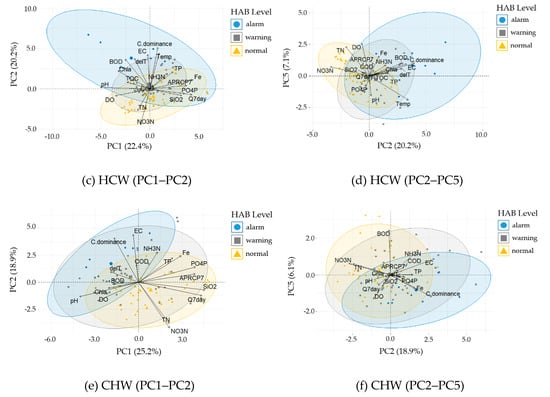 Principle component analysis (PCA) bi-plots grouped by the harmful algal bloom (HAB) level. The larger symbols indicate the group mean point for each HAB level. (a) Gangjeong Goryeong weir (GGW; PC1-PC2), (b) Dalseong weir (DSW; PC1-PC2), (c) Hapcheon Changnyeong weir (HCW; PC1-PC2), (d) HCW (PC2-PC5), (e) Changnyeong Haman weir (CHW: PC1-PC2), and (f) CHW (PC2-PC5).
