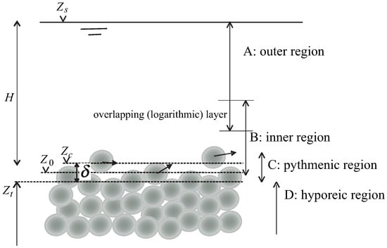 The lower boundary of the inner region is set at the elevation of the zero of the log-law, , located above (or below) the boundary zero. is known as the displacement height and can be negative if the zero of the log-law is above the boundary zero. It is noted that the boundary zero is arbitrary. In this text, it is assumed to be contained in the plane of the mean elevation of the crests. Assuming wall similarity in the sense of Townsend [], i.e., balance of production and dissipation rates of turbulent kinetic energy and near-constant Reynolds shear stresses, in the overlapping layer between the inner and outer regions, the wall-normal profile of the longitudinal velocity is expressed by Equation (1). In the pythmenic region (C), whose upper boundary can be located above the plane of the crests if the bedload discharge is large, the flow is three-dimensional and mainly determined by the bed micro-topography and granular movement. Below the elevation of the troughs, , in the hyporheic region (D), the flow may be described by Darcy or Brinkman models [].