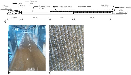 - a fixed-bed reach comprising m of large boulders (50 mm average diameter), followed by m of smooth bottom (PVC) and m of one layer of glued spherical glass beads ( mm diameter) to ensure the development of a rough-wall boundary layer (Figure 2a,b);