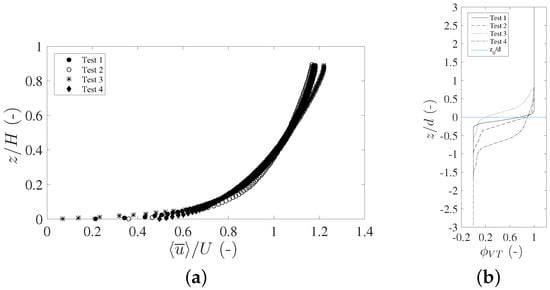 In the present experiments, the reference zero is set at the level of the crests of the roughness elements. For practical purposes, and given that particles transported as bedload induce a layer where is less than one, the reference zero was defined as the level of the wall-normal scale corresponding to . The double-averaged longitudinal velocity profiles and the space–time porosities obtained for the central section of the flume are shown in Figure 3.