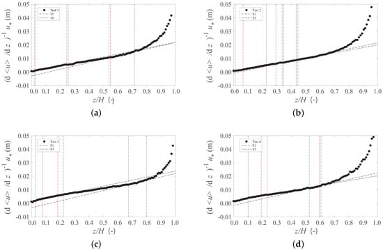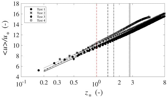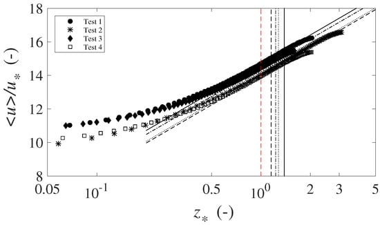 Double-averaged longitudinal velocity profiles and regression lines for Scenario 1 ( = ), where = . The red vertical line represents the lower bound of the linear reach for all tests, whereas the black vertical lines define the upper bound determined for each test. Test 1 is identified by a solid line, Test 2 by a dash-dot line, Test 3 by a dashed line, while Test 4 by a dotted line.