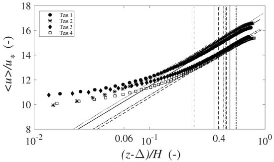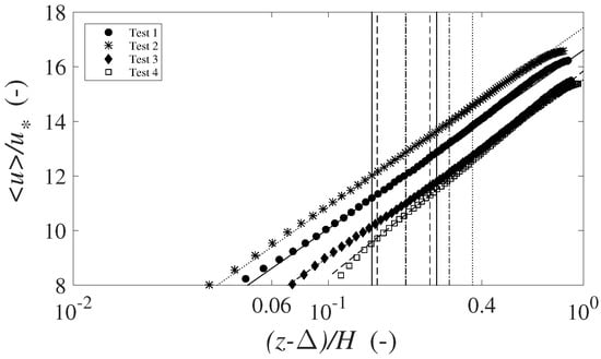 Double-averaged longitudinal velocity profiles and regression lines for the computation of the scale of the roughness elements , for Scenario 4 (, B = ). The bounds of the regression lines are marked with solid line (Test 1), dash-dot line (Test 2), dashed line (Test 3), and dotted line (Test 4).