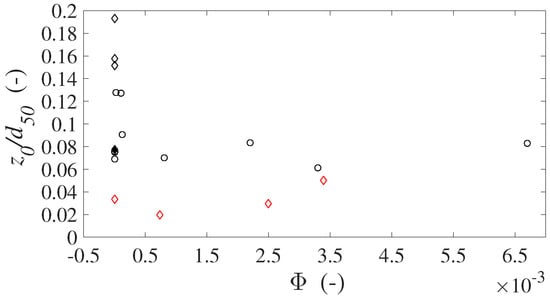 One interpretation of the results shown in Figure 9 is that bed organization plays a key role in the relationship between roughness height and . In a high complexity system, as the case of the bi-modal mixture of sand and gravel subjected to the armoring process (test of type D described in [] and represented by black open diamonds), large values of roughness height normalized by the sediment diameter are achieved when bedload transport is incipient ( slightly greater than zero). The armoring process, in fact, due to the presence of larger sediments hiding smaller particles from being eroded, produces the maximum topographic diversity in the bed.