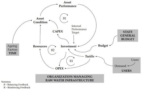 To illustrate the relationships between the different elements of the infrastructure system, a causal loop diagram adapted from Schneider et al. [6] is shown in Figure 1. The sources for investment may come from the State’s general budgets but also from the users, embedded as a part of the water tariffs.