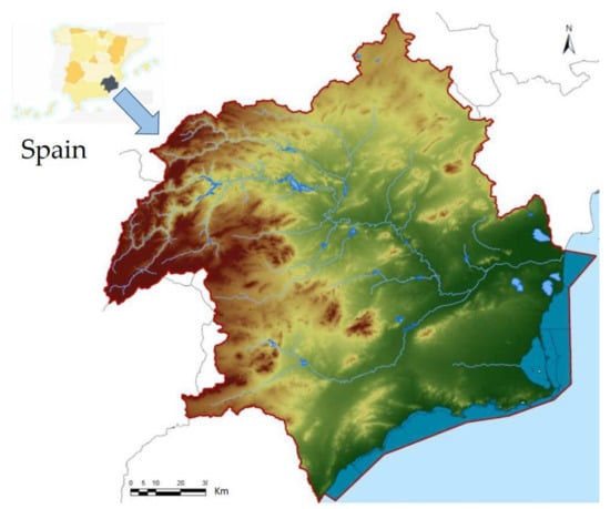 Part of the infrastructures owned and operated by the Segura River Basin Authority in Spain have been used as a case study. The Segura River basin is located on the south-east part of Spain, as shown in Figure 2, with an extension of 20,234 km2.