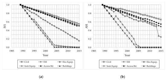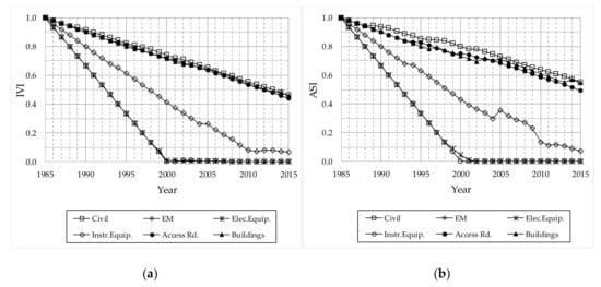 Values of IVI and ASI at the Asset Level can be derived from IVI and ASI values at the Element Level, using Equations (8) and (16), respectively. Figure 5a,b show the results obtained for Asset 1 and Asset 2, respectively. The results with IVI show an overall fair condition for both assets by year 2015, but a lack of maintenance as the target value of 0.4 is going to be reached 15–20 years before the end of the service life. The results with ASI show an overall poor condition for both assets (0.4 ≤ ASI < 0.6) by year 2015, pointing to an accumulated lack of maintenance. The reason for having such values despite the lack of maintenance in some elements such as electrical and instrumentation equipment is found in the weights applied in the calculation of the indices. Both the replacement cost of these elements used in IVI and the amount needed for maintenance used in ASI are much less than for other elements, such as civil works or electromechanical equipment. Therefore, their impact on the overall index value is lower.