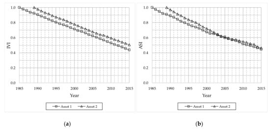 Asset condition assessment for Assets 1 and 2: (a) IVI index; (b) ASI index.