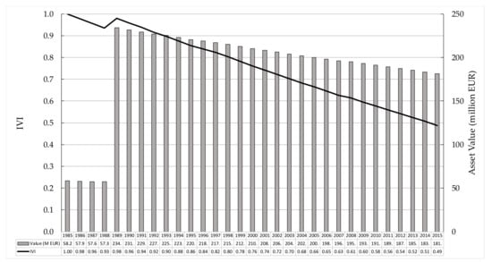 The IVI values of mature, well-maintained infrastructures should be in the vicinity of 50% (40–60%). Higher values point towards one of the following situations: (1) young infrastructures; (2) old infrastructures subject to a recent and significant expansion phase; (3) old infrastructures subject to over-investment in rehabilitation. IVI values below 0.4 reflect accumulated lack of capital maintenance [43]. To help in the interpretation of the results obtained in the following sections it is worth noting that, according to this model, a perfectly maintained infrastructure would have a linear IVI decreasing from 1 at commissioning year to a value of 0.4 at the end of the service life.