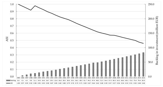 The evolution along time of the total current value of assets of OS-1 and the corresponding IVI values are shown in Figure 7. Current value at a given year is represented by the vertical bars while IVI index is shown as a line. The evolution along time of the backlog in investment and the corresponding ASI values are shown in Figure 8. Cumulative backlog is represented by the vertical bars and the ASI index is represented by the line. The results with IVI show an overall fair condition (0.4 ≤ IVI) whereas the results with ASI show that OS-1 entered the poor condition at year 2006. Accumulated backlog in maintenance investment by year 2015 was approximately 83 million EUR, considered from the commissioning date of assets.