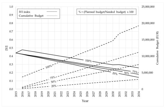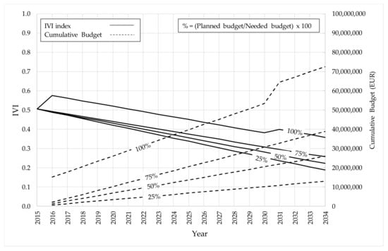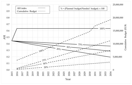 Different scenarios of investment effort have been simulated for the period 2016–2034. Base Case is defined in the same way as Asset 1: maintenance is 100% of theoretical requirement, including pending renewals of elements performed in year 2016. Three scenarios assuming that future investments will be lower than Base Case are considered: 75%, 50% and 25%, where the 25% case corresponds to the real level of investment during the period 1989–2015. Figure 13 and Figure 14 show the evolution of asset condition indices IVI and ASI, respectively, and the associated cumulative budget for each scenario.