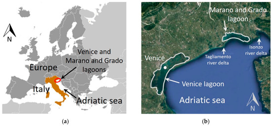 Venice lagoon and Marano and Grado lagoon depicted in the (a) European context and (b) in the Northern Adriatic Sea.
