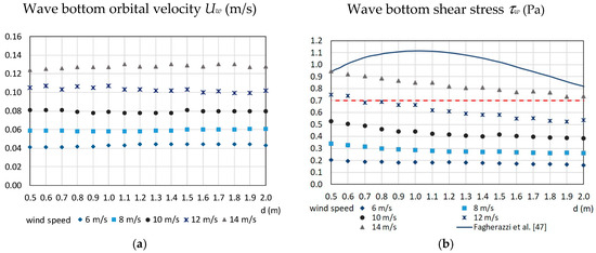 (a) Root mean square value of the maxima of the bottom orbital velocity and (b) wave bed shear stress computed on different depths d by means SWAN [61]. The equivalent roughness height is 0.05 m. The dashed line indicates the critical erosion threshold adopted by Fagherazzi et al. [47] and is evaluated as a mean value for the tidal flats of the Venice lagoon [63,64], while the continuous line is the non-monotonic curve that the same authors proposed for a wind speed equal to 8 m/s.