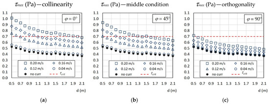 Figure 3 shows the effects of the combination of waves and current under three different scenarios between the flow direction and the wave rays, and suggests current velocities which lead to maximum shear stress greater than the chosen critical threshold. The wave component in this case is relative to a wind speed of 10 m/s.