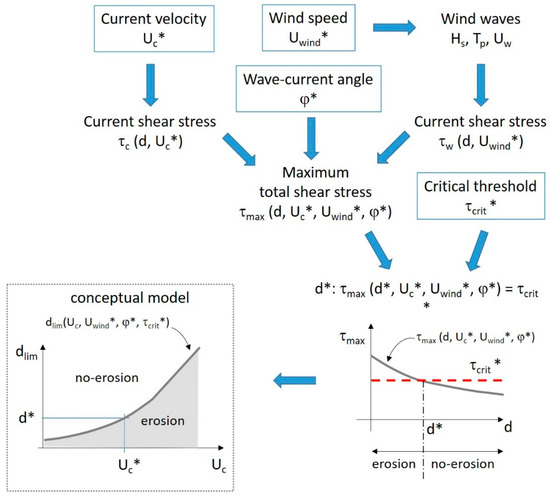The asterisked variables inside the rectangles represent the values which the conceptual model requires as input. The maximum total bed shear stress can be computed at varying depth once the current velocity Uc*, the wind speed Uwind* and the angle φ* between the resultant wind waves and tidal current, have been established. The depth d* corresponds to the value for which this maximum shear stress is equal to the critical erosion threshold τcrit*. In this manner, a limit depth separates two conditions: an erosion condition for depths lower than d* and a no-erosion condition for depths greater than d*. The conceptual model provides the theoretical curve of this limit depth dlim(Uc, Uwind*, φ*, τcrit*) at varying current velocities and for different assigned values of Uwind*, φ*, τcrit*.