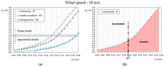 This procedure has been performed by computing the total bed shear stress for different wind speeds and comparing it with some values of the erosion critical shear stress, among those proposed in literature [63,64,65,66]. In this manner, many curves representative of the limit depths between erosion conditions and not, have been obtained. In all these cases, the three angles of 0°, 45° and 90° between waves and current directions have been analyzed.