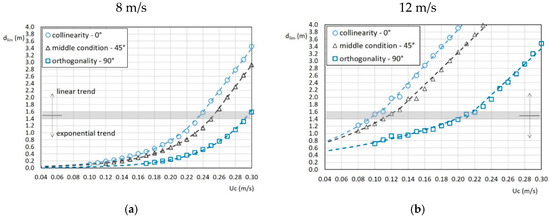 Water depth d corresponding to the maximum bed shear stress equal to the critical threshold of 0.7 Pa obtained for different values of the current velocity Uc and angles between the wave motion and the flow direction. The wave field is generated by a wind speed of (a) 8 m/s and (b) 12 m/s. The dashed lines are regression curves.