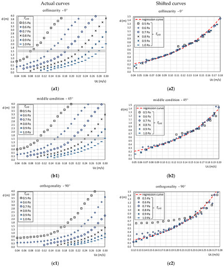 Observing the arrangement of these curves, it is noted that they can be horizontally shifted towards each other until an almost perfect overlapping is obtained as shown in Figure 7(a2,b2,c2), with the exception of the orthogonal configuration for which there are some discrepancies. These curves are indicated as “shifted”.