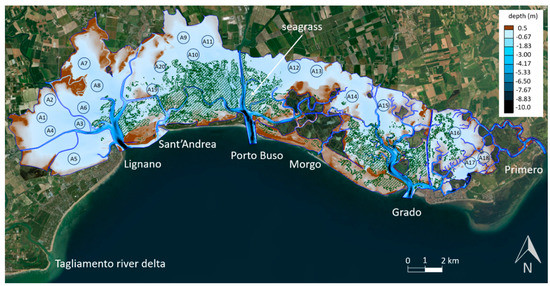- Triches, A.; Pillon, S.; Bezzi, A.; Lipizer, M.; Gordini, E.; Villalta, R.; Fontolan, G.; Menchini, G. Carta Batimetrica Della Laguna di Marano e Grado; Arti Grafiche Friulane; Imoco spa: Udine, Italy, 2011; p. 39. ISBN 978-88-95980-02-7. [Google Scholar]