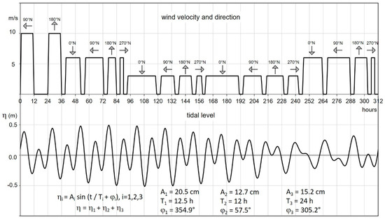 Representative sequence of winds and water levels acting over an annual period, as deduced from data collected inside the Marano and Grado lagoon and subsequent analyses [51]. The tidal level variation is the sum of three main harmonic components which are defined by the respective amplitude Ai, period Ti and phase φi.