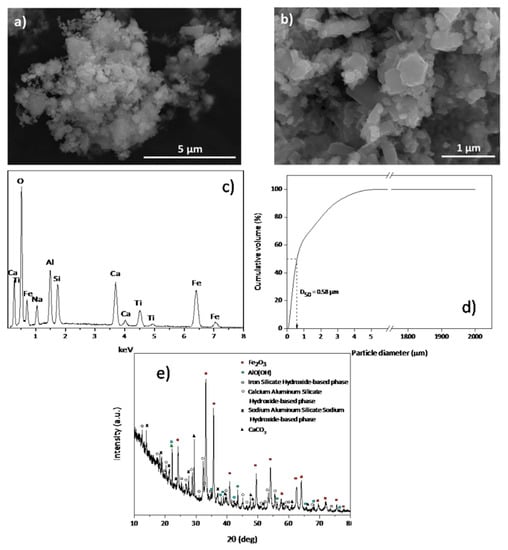 SEM images of RM are shown in Figure 1a,b, with individual particles extending from the nanometer to sub-micrometer range, and tending to form agglomerates with sizes in the range 1–10 μm. Elemental analysis provided by SEM-EDS (Figure 1c) showed that Fe, Al, Ca, Ti, Si and Na are present in the waste. The agglomerates found in SEM are confirmed by the volumetric particle size distribution (Figure 1d) which shows a median size (D50) of 0.58 µm. Note also that 10% of particles have particle diameter below 0.17 µm (D10) and 90% of particles show a diameter lower than 2.86 µm (D90).