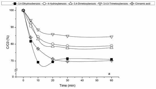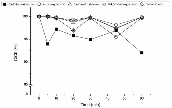 Initially, the capacity of RM to adsorb the contaminants on its surface was evaluated (Figure 2). The phenolic acids were contacted with 1 g/L RM during 1 h at pH 3.4 (natural pH of the phenolic mixture prepared). According to Figure 2, it is shown that RM has a negligible ability to adsorb phenolic acids. In fact, only 3,4-dihydroxybenzoic acid was partially adsorbed (less than 10% of its initial concentration). In this sense, it is concluded that the adsorption of contaminants on the surface of the solid catalyst will not be the primary mechanism for their degradation. This low adsorption capacity can be related, not only with the small BET surface and low pore volume as above mentioned, but also the low affinity of the adsorbent to the phenolic acids in the conditions of the test. Moreover, the RM zero point charge pH is 13, thus at the reaction conditions, it should be positively charged. This can explain the low phenolic acids adsorption at its surface as observed in Figure 2.