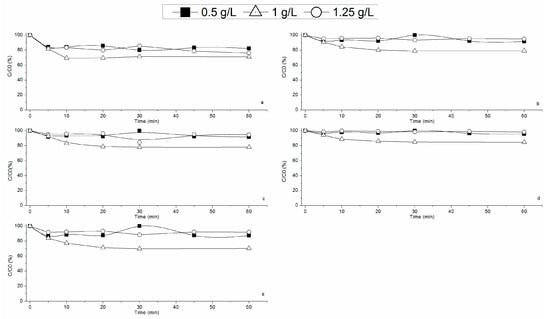 Increasing the catalyst load from 0.5 to 1 g/L improved the efficiency of the process. This effect is due to the presence of more active sites to promote the production of hydroxyl radical. However, above this value (1.25 g/L), the degree of degradation decreases, reaching the same level as the one obtained with 0.5 g/L of RM. Thus, above 1 g/L of catalyst load, the scavenger effect prevails. Therefore, the next tests were carried out using 1 g/L of RM.