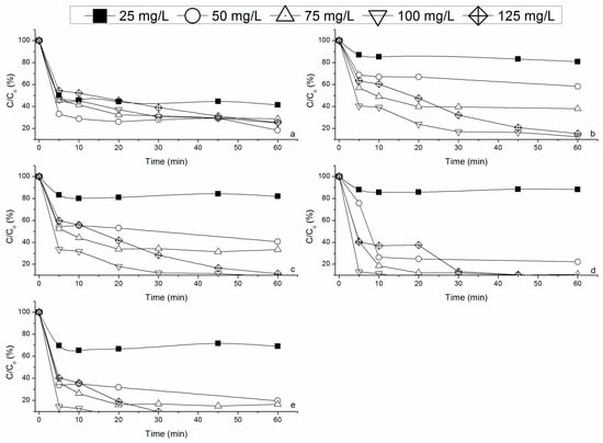 The concentration of H2O2 was evaluated within the range of 25–125 mg/L, pH 3.4, and using 1 g/L of RM (selected in the previous section). Figure 5 shows the normalized concentration of each phenolic acid for 60 min of the reaction, at different concentrations of hydrogen peroxide.