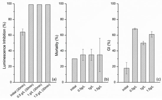 Luminescence inhibition of A. fischeri (a), mortality of C. fluminea (b) and germination index of L. sativum (c) for the initial phenolic acids mixture and different RM concentration (0.5, 1 and 1.5 g/L) (pH 3.4; concentration of H2O2 = 100 mg/L).