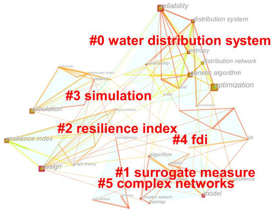 CiteSpace analyzed these records and generated the visualized network. There were 55 nodes and 121 links in the keyword co-occurrence network. The cluster analysis provided by CiteSpace detected the cluster labels. The six labels were water distribution system, surrogate measure, resilience index, simulation, FDI, and complex networks (Figure 1). Labels sorted in descending order by the number of member references, starting from the largest cluster #0 water distribution system to the smallest cluster #5 complex networks.