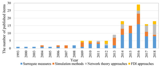 The distribution of annual publications differed for different methods, and among the classified types. A certain number of papers on surrogate measures were published each year, implying that surrogate measures were the most widely used approaches. Simulation methods were the second-most widely used methods, whereas FDI and network theory approaches appeared later. The network theory approaches trended upward after 2013, indicating their increasing application to WDN resilience evaluations.