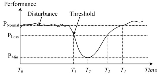 To illustrate Figure 3, we borrow an example from Zhuang [83] and Buzna [105]. The performance of a WDN designed to absorb failures fluctuated between PNormal and PLoss after a pipe burst. The performance threshold at T1 was triggered by an extreme event such as an earthquake, or when a small disturbance evolved into large-scale failures. After several pipe bursts, the service performance dropped to PMin. During the T1–T2 period, the pressure reduced and the flow rate of the water delivered to customers decreased. A main pipe breakage would cut the water supply to a whole area. The reduced pressure caused hydraulic failures. Water utility managers invested their resources into quick and effective repair from T2 to T3, and the service performance bounced back to PLoss. During T3 and T4, the water utility managers rebuilt or optimized the destroyed WDN, and restored the performance to the pre-disturbance level PNormal. However, under new challenges such as climate change and increased water demand, WDNs must run more efficiently and stably than in the past. Long-term measures for demand-meeting and uncertainty adaptation could be implemented after T4.