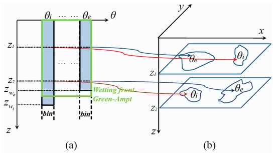The mechanism in the Talbot–Ogden model. (a) Bins corresponding to different porosity θ-values compared to the wetting front in the Green–Ampt model; (b) Different moisture content in a soil over the vertical domain.
