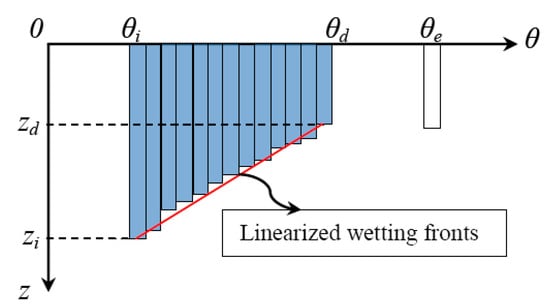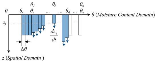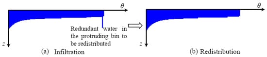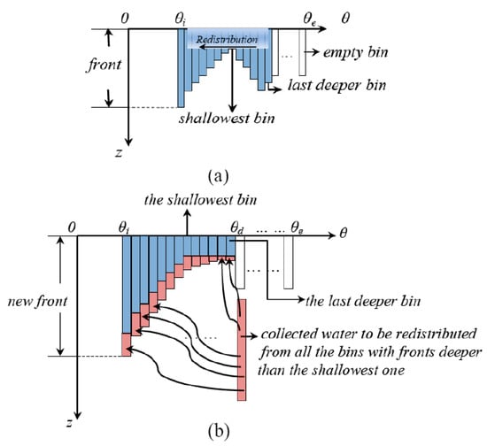 Due to the capillary effect in soil, water in bins with large θ-values tends to flow to those bins with smaller θ. This horizontal flow is referred to as the redistribution. It reorganizes the redundant water collected from those protruding wetting fronts in all saturated bins proportional to the values of the capillary pressure ψ(θj) of every bin participating in the redistribution []. In the redistribution process (Figure 3b), the last deeper bin is defined as the first saturated bin found over the moisture content domain along the negative direction of the θ-axis whose front depth is higher than the shallowest saturated bin. Note that the wetting front depths gradually decrease from left to right after the redistribution since the capillary pressure in the bins on the left acts immediately on water found at depth in the bins to the right in this model [].