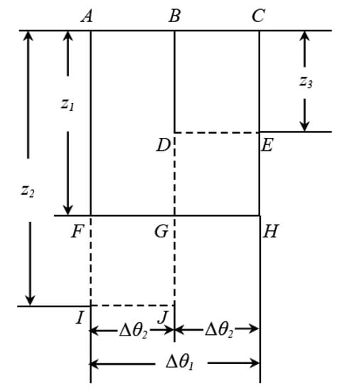 Figure 5 presents the model of one bin and its division into two bins. The rectangle ACHF represents bin1. Its wetting front is FH, its width is ∆θ1, and its depth is z1. Similarly, the two bins in Figure 5 are bin2 (ABJI) and bin3 (BCED) with wetting fronts IJ and DE, respectively. Both their bin widths are equal to ∆θ2, which means ∆θ1 = 2∆θ2. Their front depths are z2 and z3. It is assumed that the entire water content for the two cases is the same. So, the water in bin1 equals that contained in the union of bin2 and bin3, that is . These two cases can be compared. Let VOnebin and VTwobins denote the instantaneous infiltration rates for each case. VOnebin is calculated by