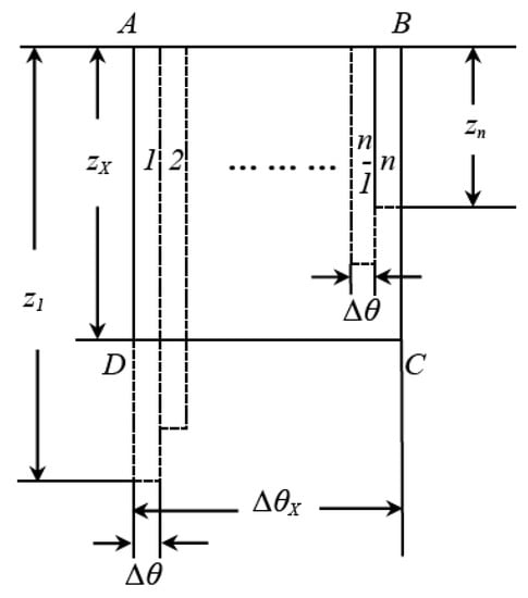 Similarly, n bins can be obtained by equally discretizing the moisture content domain of the one bin case into n pieces. All other parameters remain constant. In Figure 6, the rectangle ABCD represents one bin binX. Its depth and bin width are zX and ∆θX, respectively. Then binX is split into n bins, marked by bin1, bin2, …, binn−1, and binn. All these new bins have the same width ∆θ. Their depths from left to right are z1, z2, …, zn−1 and zn. It is similar to the previous example to have , n∆θ = ∆θX = θd − θi, and z1 ≥ z2 ≥ … ≥ zn. By geometry there exists an index l such that z1 ≥ z2 ≥ … ≥ zl ≥ zX ≥ zl+1 ≥ … ≥ zn. The infiltration rate of binX is