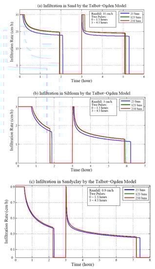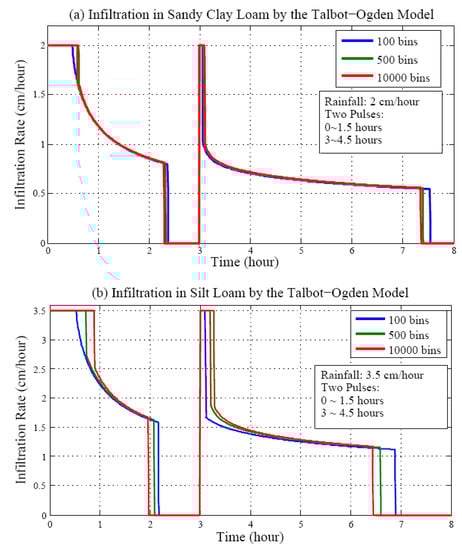 For the three cases in Figure 10a,b, the use of (27) yields Table 4. In Table 4, for sand clay loam, the difference in average infiltration rates using 100 bins and bins is