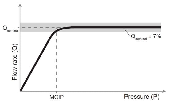 The largest contributors to pressure losses in a drip irrigation system are usually the drip emitters themselves, especially in the case of pressure-compensating (PC) emitters [7]. PC emitters maintain a nearly constant flow rate regardless of variation in water pressure, as long as that pressure is above the Minimum Compensating Inlet Pressure (MCIP) (Figure 1). PC operation is beneficial to crops, as it results in a uniform distribution of water to all parts of the field, in contrast to non-PC emitters, which decrease flow at lower water pressures in areas farther from the pump. Most commercially-available PC emitters have a minimum operating pressure of 50–100 kPa (0.5–1.0 bar). Once additional pressure losses in piping, filters, and fertigation systems are accounted for, the required pump outlet pressures for a surface water source are on the order of 150–200 kPa (1.5–2 bar) or greater, depending on field size. Significantly reducing the MCIP of PC emitters may, therefore, reduce the pump capacity and its power requirement, leading to lower capital costs for the pump, as well as lower capital costs for the power supply of off-grid systems or a reduced recurring electricity cost for grid-connected systems.