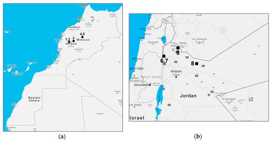 Locations of experimental sites in (a) Morocco and (b) Jordan (Google Maps, 2018a, 2018b). In Morocco, the sites were located in the Marrakech (1–3) and Beni Mellal (4, 5) regions. In Jordan, the sites were in the Northern Jordan Valley (6, 7), Al-Mafraq (8) and Ramtha (9) regions.