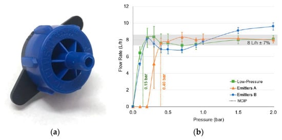 (a) Photograph of the low-pressure emitter. (b) Characteristic curves for low-pressure and conventional emitters used in field trials, as measured in lab tests (n = 25 for each type of emitter; mean and standard deviation are plotted). All emitters have a nominal flow rate of 8 L/h, low-pressure emitters have an MCIP of 15 ± 5 kPa (0.15 ± 0.05 bar); emitters A (conventional on Morocco sites) have an MCIP of 40 ± 5 kPa (0.40 ± 0.05 bar) for the PC-NL version; emitters B (conventional on Jordan sites) have an undefined MCIP as the flow does not reach a compensated state, but the minimum pressure above which the flow rate remains equal to or greater than nominal is 95 ± 5 kPa (0.95 ± 0.05 bar).