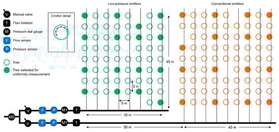 Diagram of a typical experimental site, featuring two plots with low-pressure emitters and conventional emitters as the control (site 6, Sharhabeel Citrus). Each circle represents one citrus tree; the filled-in circles are the 16 trees per plot selected for uniformity measurement. At each of these trees, the flow rates of two emitters were measured for a total of 32 emitters per plot, and the measured flow rates were used to calculate statistical uniformity of water application throughout the plot. The instrumentation section components are shown, including the valves used to set submain pressures, and pressure and flow measurement instruments.