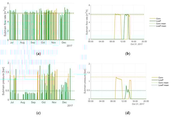 Example of submain (a) flow rate, and (c) pressure sensor data collected during the 2017 irrigation season for low-pressure (LowP) and conventional (Conv) emitter plots at the Sharhabeel site with pomegranates. The mean values over the season are shown with dashed lines. Zoom in on one day of sensor data for (b) flow rate and (d) pressure, comprising one irrigation event on the low-pressure emitter plot and two irrigation events on the conventional emitter plot. The low-pressure emitters delivered the same flow rate at a submain pressure of 40–60 kPa (0.4–0.6 bar) as the conventional emitters at a pressure of 100–120 kPa (1.0–1.2 bar).