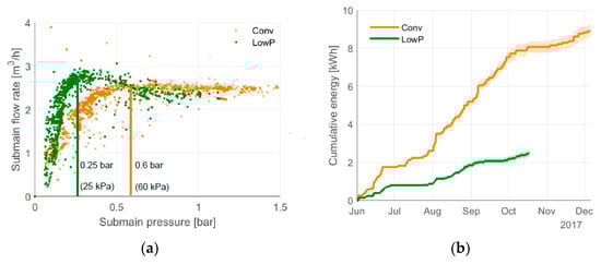 Sensor and calculated specific energy data for site 1 in Morocco. (a) Submain flow rate plotted against submain pressure, for pipes supplying both low-pressure (LowP) and conventional (Conv) emitter plots. All recorded data points are plotted, even for irrigation events with pressures below the MCIP, in order to demonstrate the full performance curve of the two emitters. The setpoint pressures for both submains are indicated with solid lines. (b) Cumulative hydraulic energy over the course of data recording. Only post-filtered data points are included in this plot. Vertical segments represent the increase in energy during an irrigation event; horizontal segments are data gaps or non-irrigated periods when flow rate and pressure are zero. The shaded areas represent the uncertainty due to flow and pressure sensor accuracy.